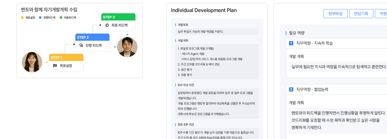 멘토와 함께 자기개발계획을 세우고 피드백을 주고받을 수 있어요.진행 과정과 최종 평가까지 기록되어 회사가 성장 지원을 체계적으로 관리합니다.