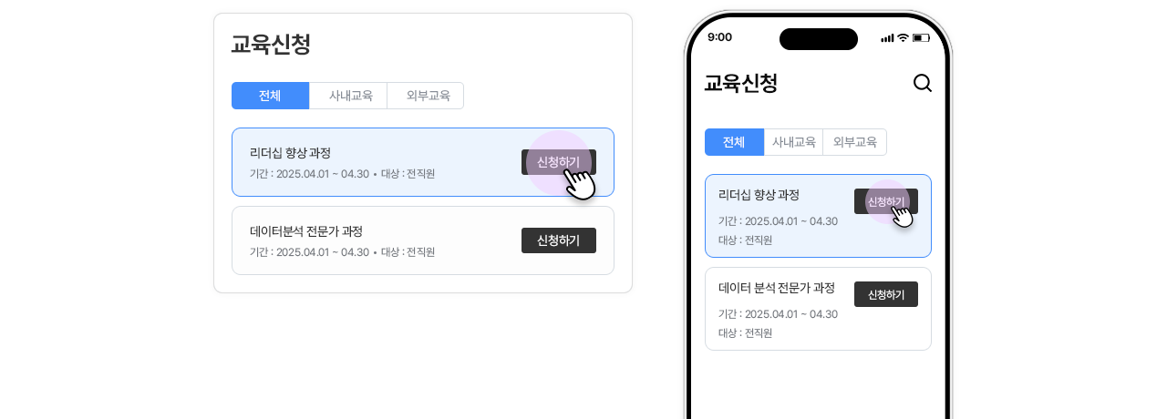 구성원이 필요한 교육을 직접 선택하고 신청할 수 있어요.자발적인 학습 참여를 통해 교육 운영의 효율을 높입니다.